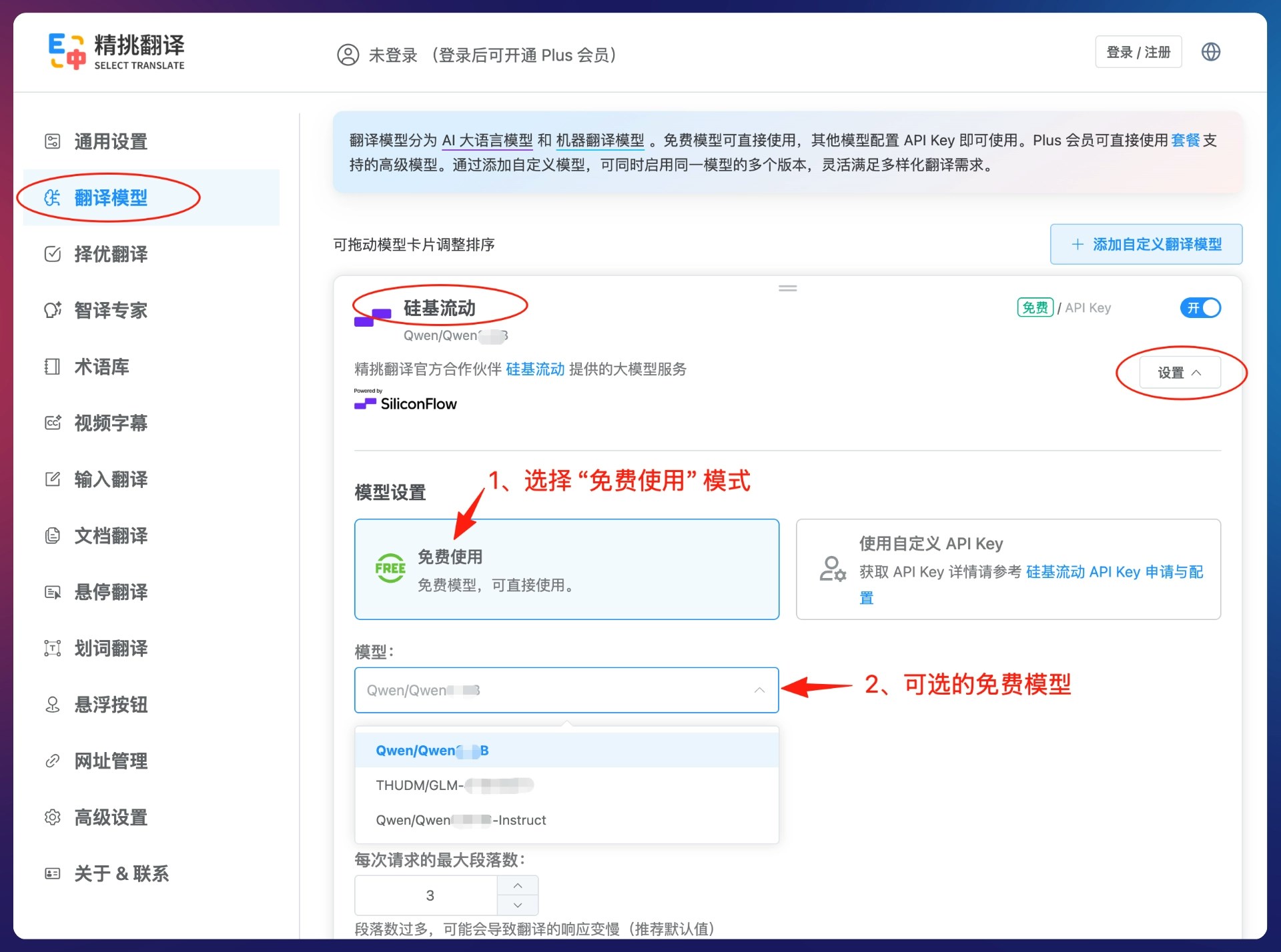 - 切换 SiliconFlow 提供的免费模型。在精挑翻译插件设置的【翻译模型】管理页面中找到【硅基流动】模型,点击模型卡片的【设置】>(1)选择【免费使用】模式 >(2)在【模型】下拉框中选择你需要的模型即可。