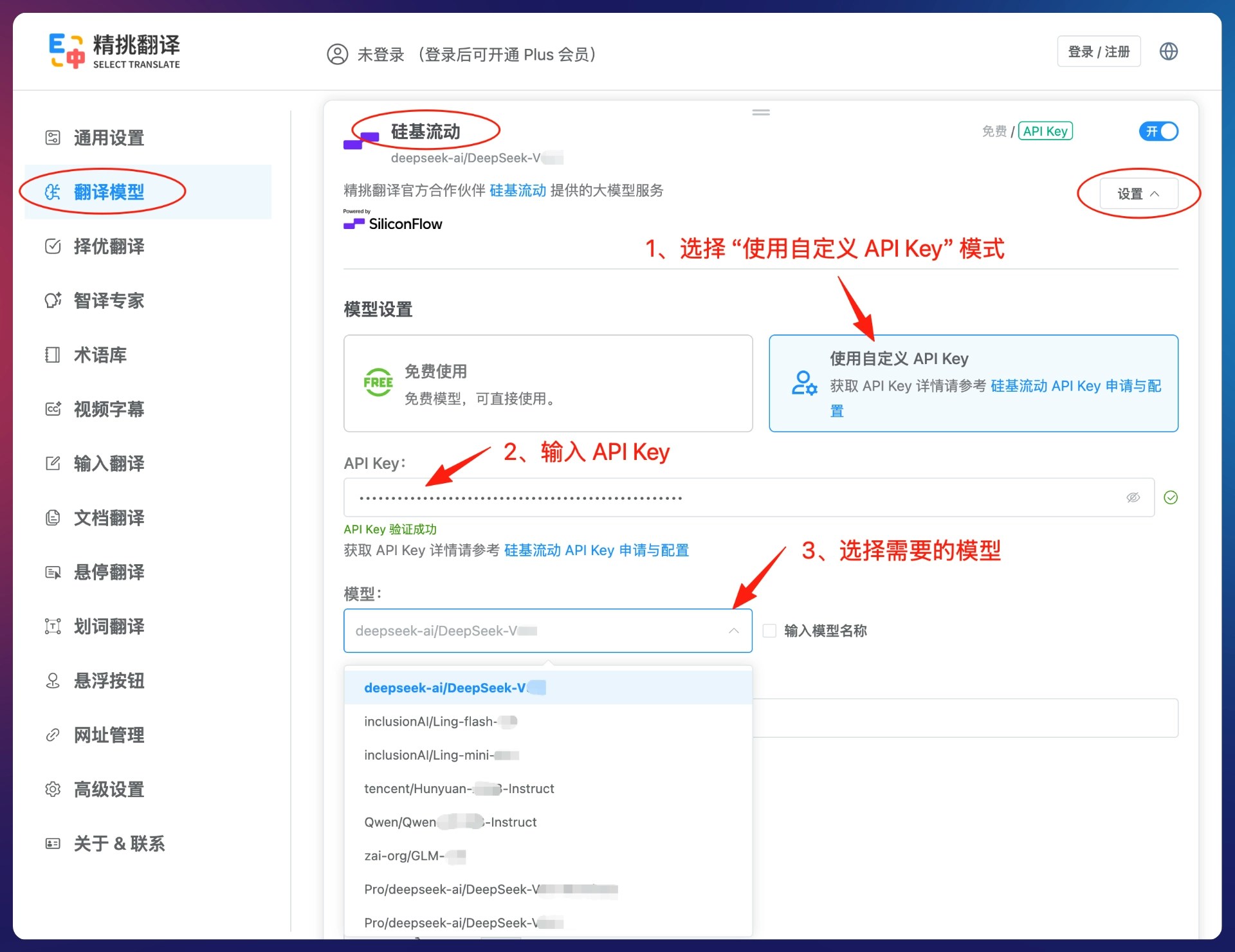 - 在精挑翻译插件设置的【翻译模型】管理页面中找到【硅基流动】模型,点击模型卡片的【设置】>(1)选择【使用自定义 API Key】模式 >(2)在【API Key】中输入 API 密钥 >(3)在【模型】下拉框中选择你需要的模型即可。