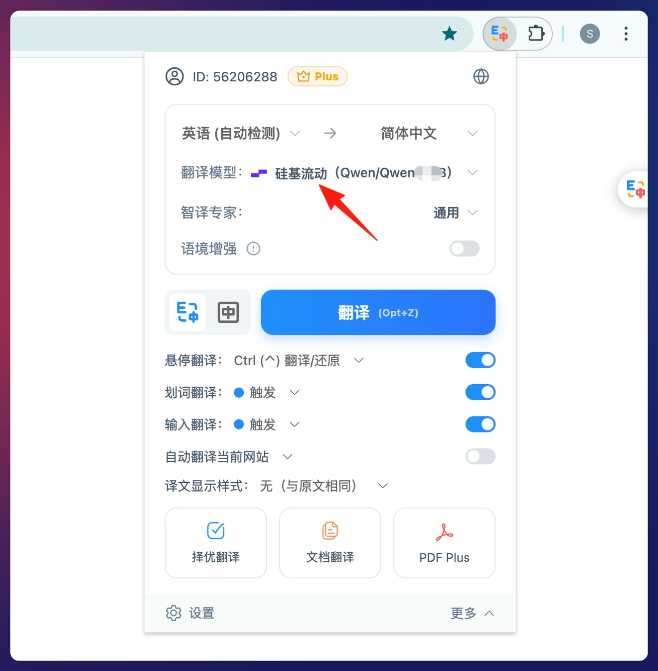 在精挑翻译扩展面板的【翻译模型】选项中选择 SiliconFlow 模型即可进行翻译。