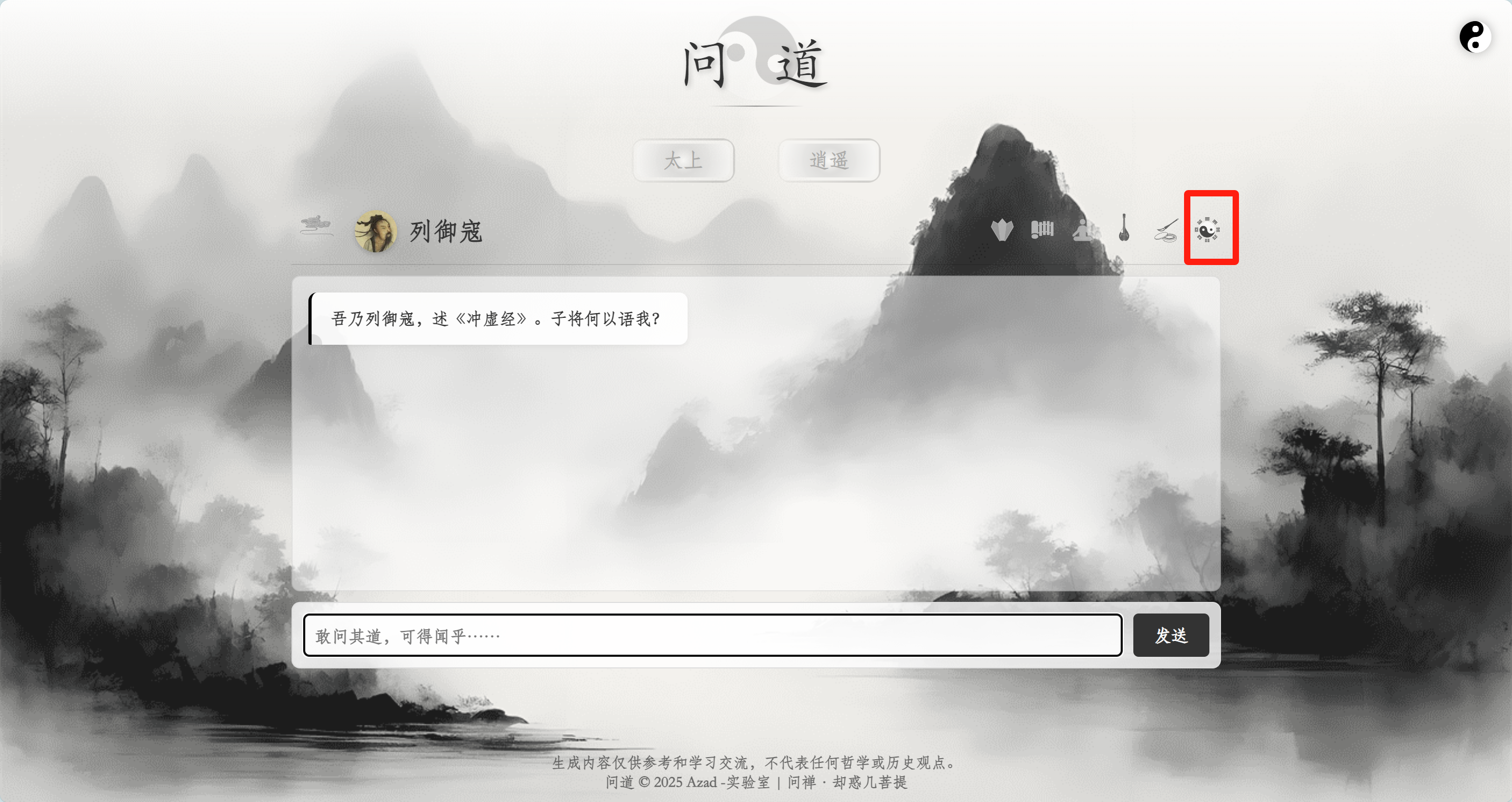 1、问道 首页选择任一人物卡片,进入对话框后点击右上角 太极八卦图标,打开 设置框,API Key 处填入刚刚复制的 API 密钥。API 地址和模型名称、温度也可根据需求自定义。设置完成后,点击 保存设置 生效。
