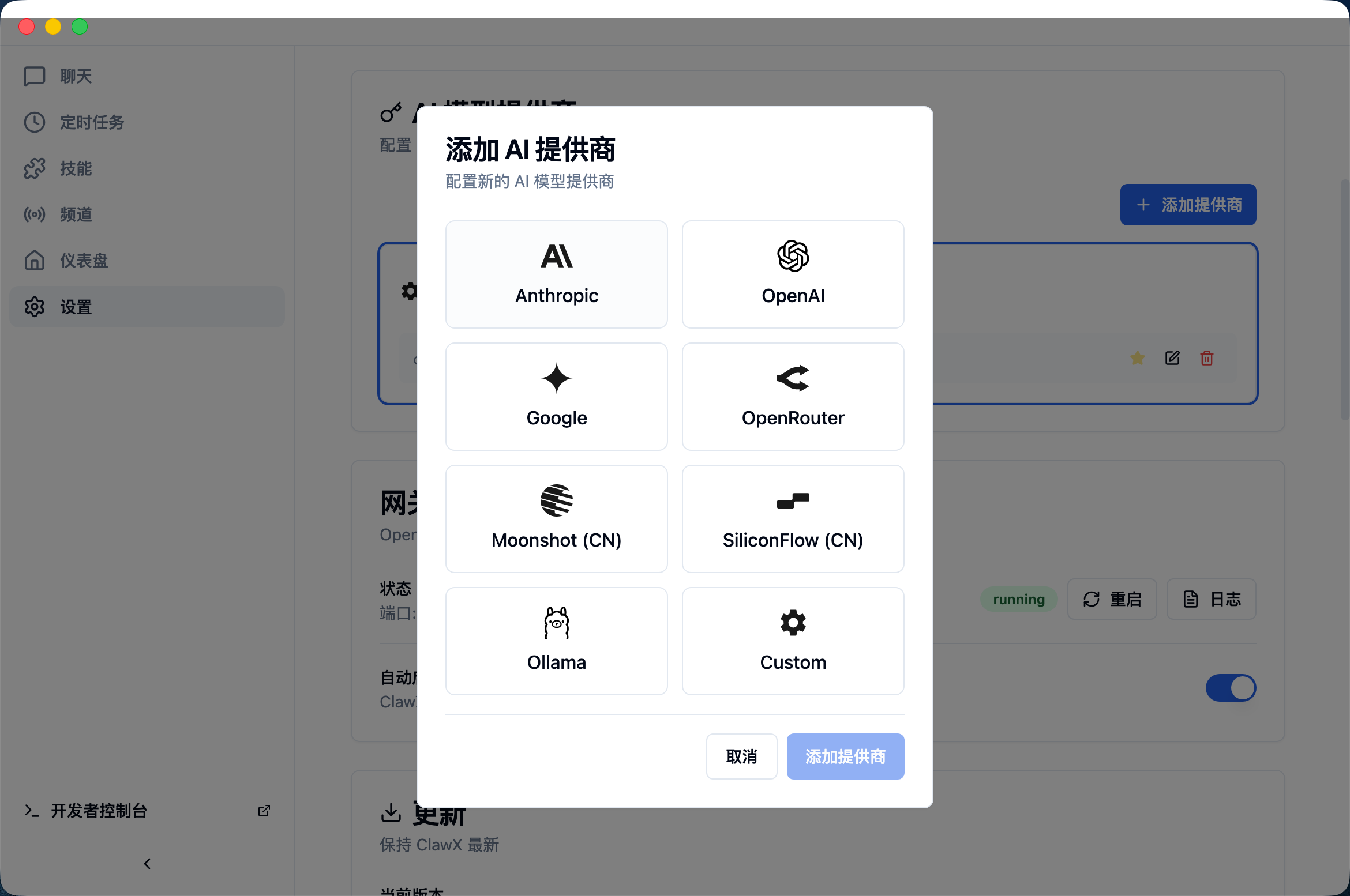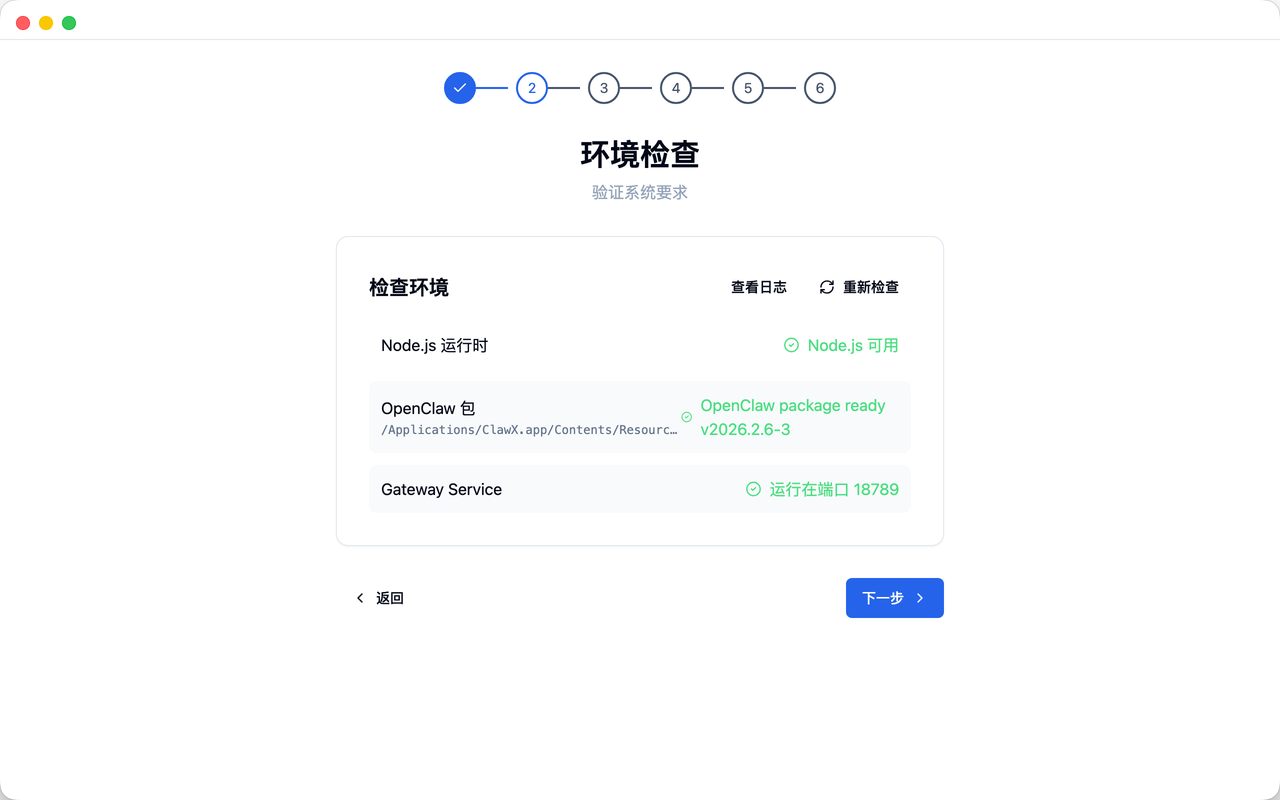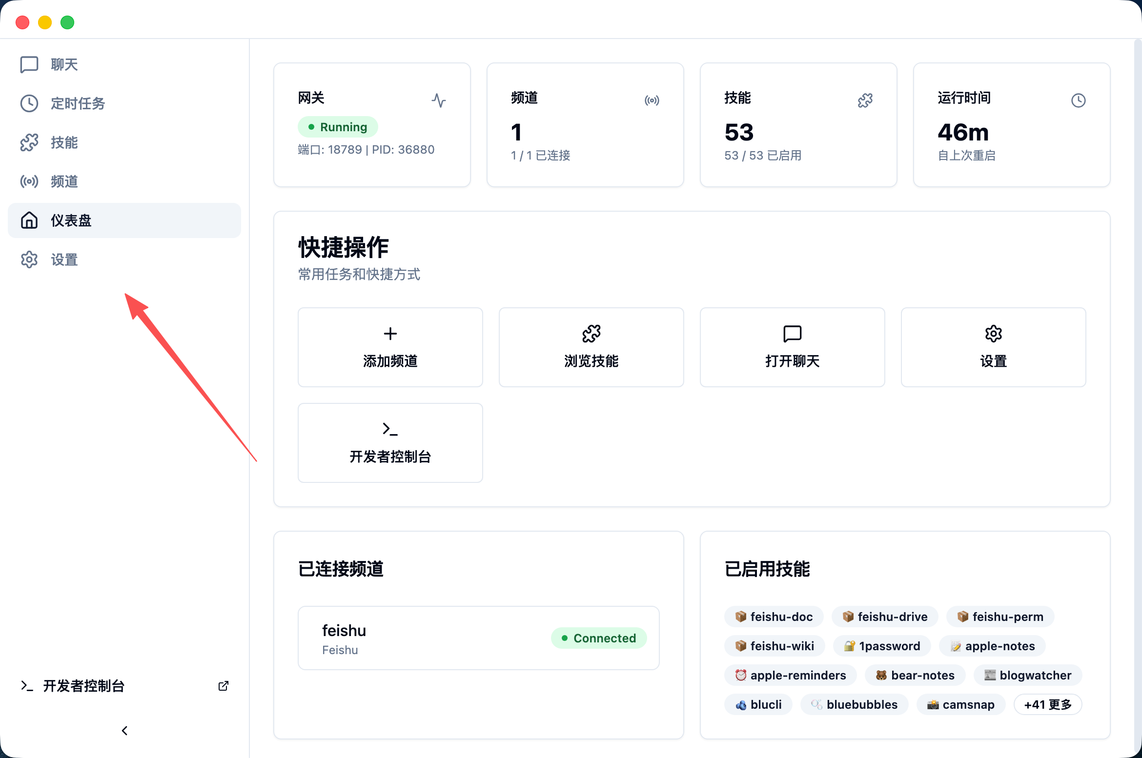 - The Chinese onboarding page helps you step by step to check environment dependencies. Connections to channels such as Feishu, Discord, Telegram, etc., can be configured after entering the software.