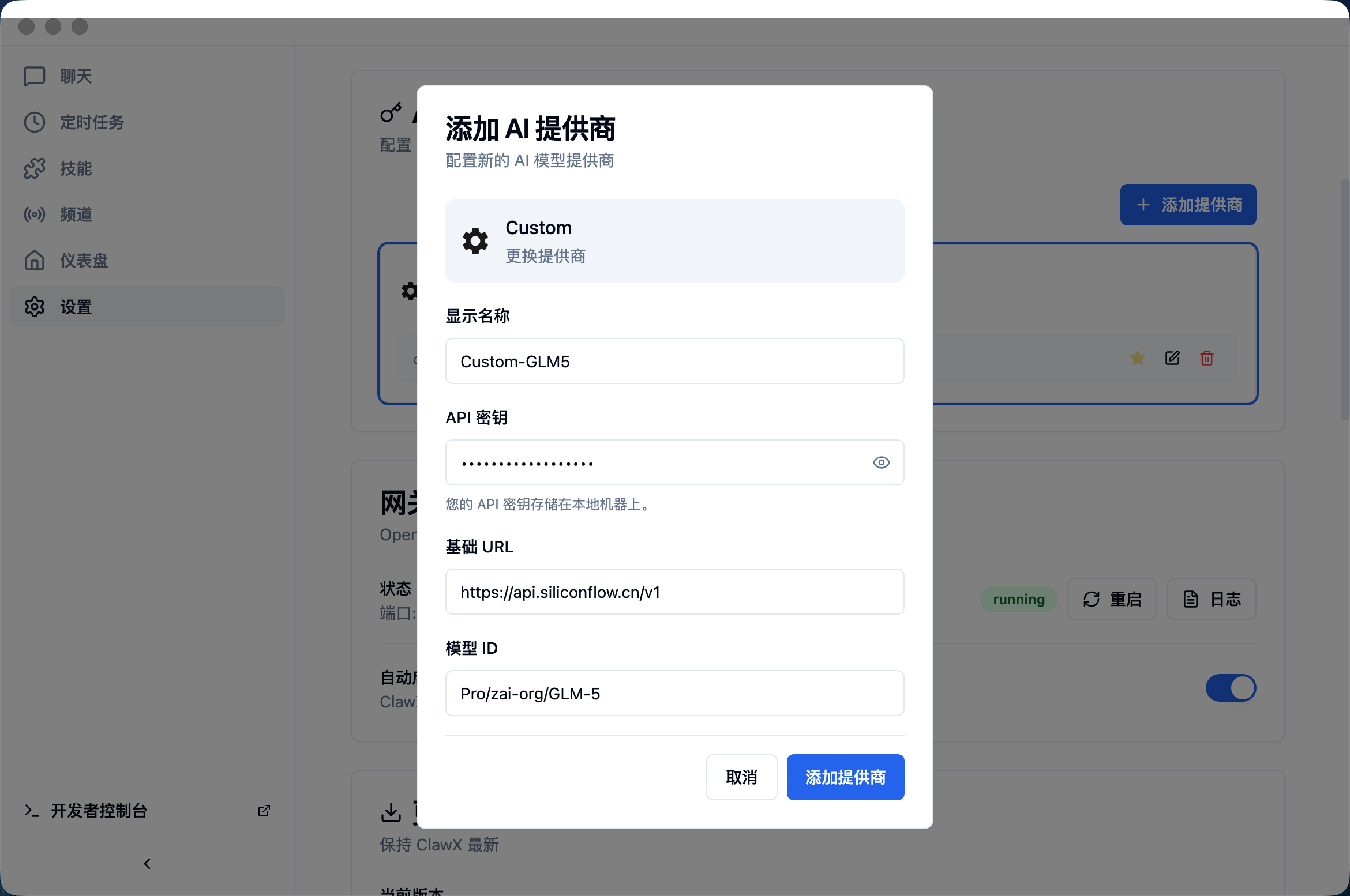 - Click Settings - Add Provider Select SilinconFlow (CN). By default, the strongest domestic flagship model is selected. If you want to switch models, please manually choose Custom for configuration.