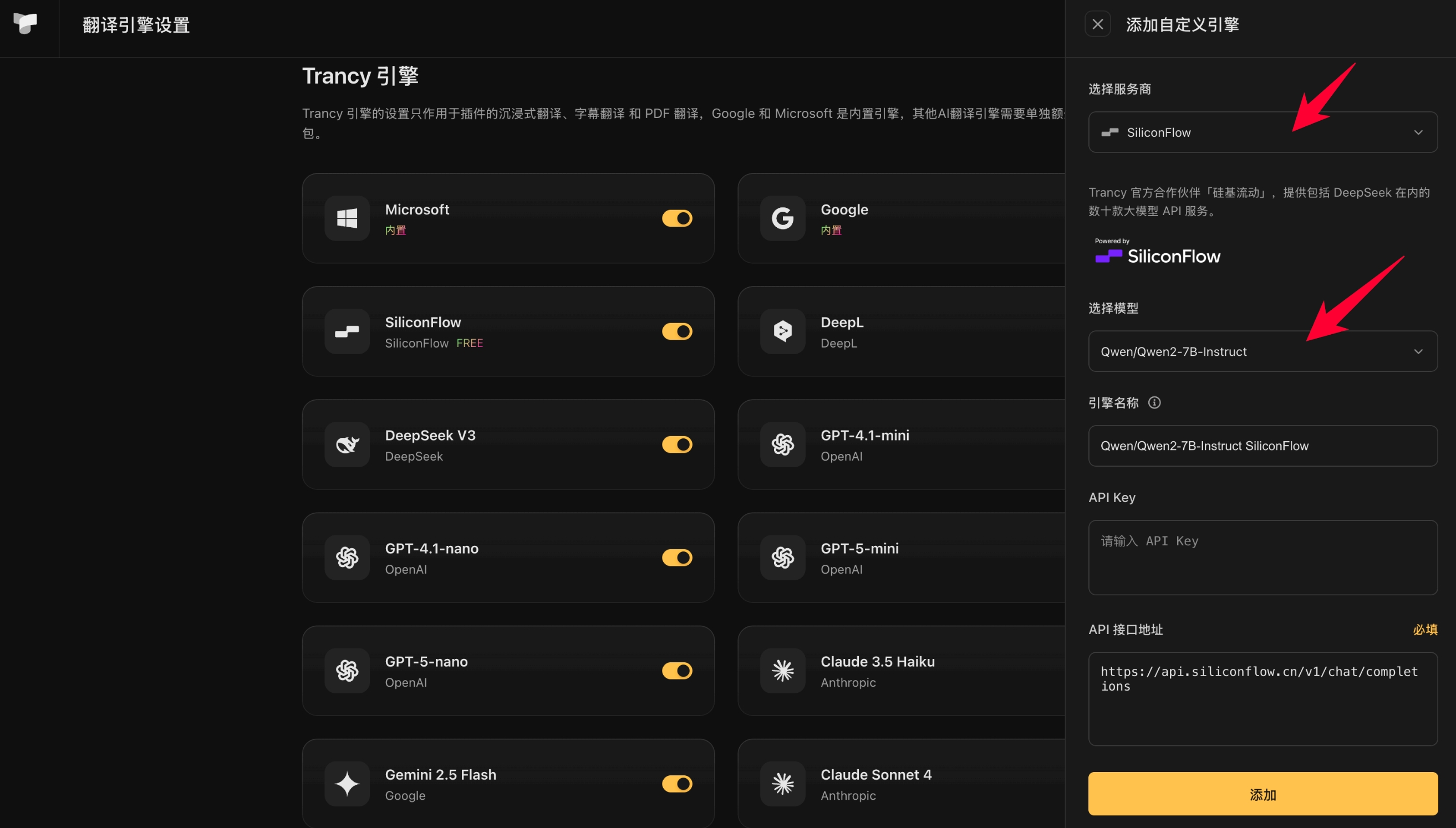 Supported on major browsers (Chrome / Edge / Firefox / Safari). Get it here: TrancyUse SiliconFlow in Trancy
